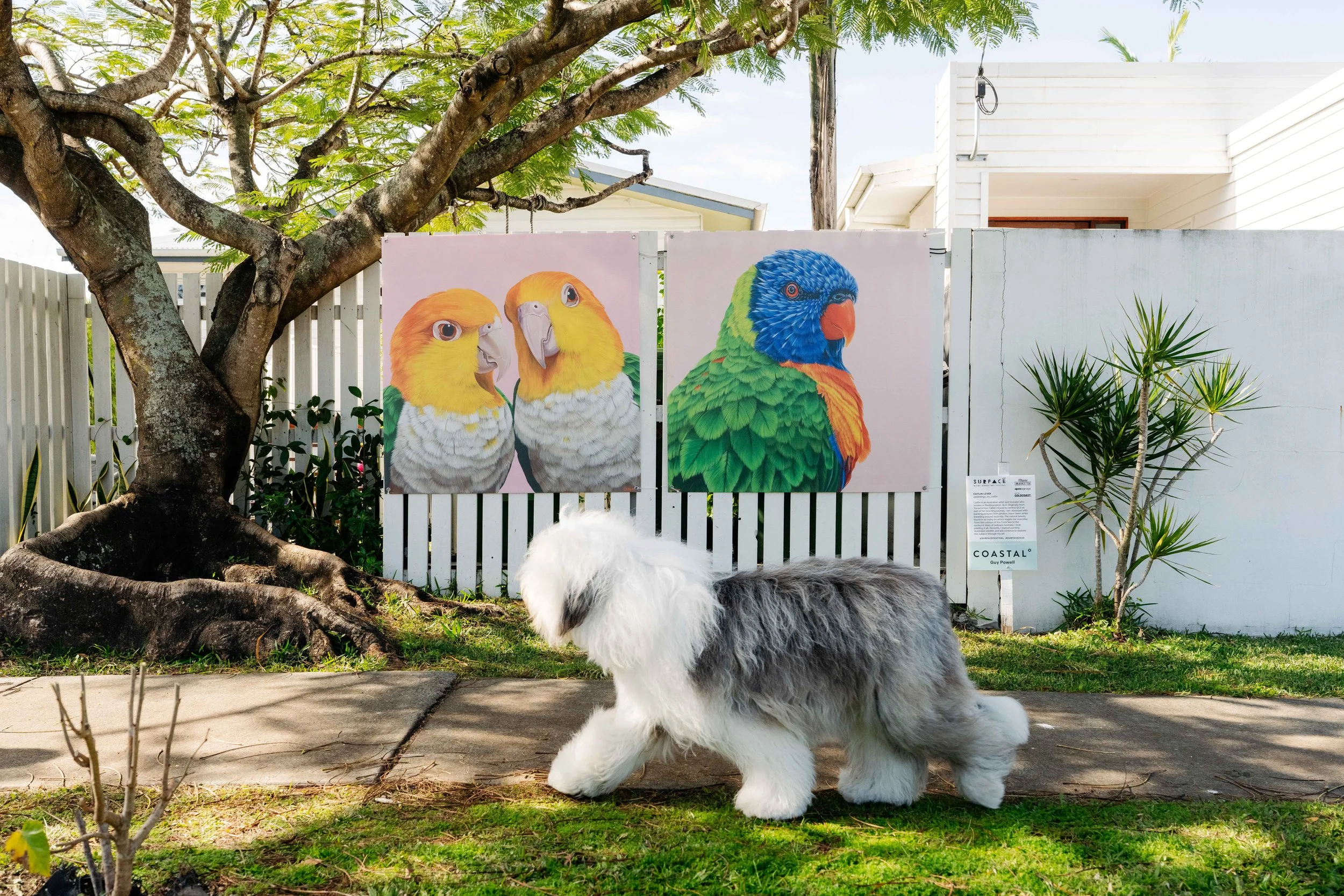 Fence Line Exhibition is a curated outdoor print exhibition of artists' work where they are installed on residential properties in Miami - Australia, creating an extensive art trail. Audiences are encouraged to ride, roll and stroll the streets and find the art.